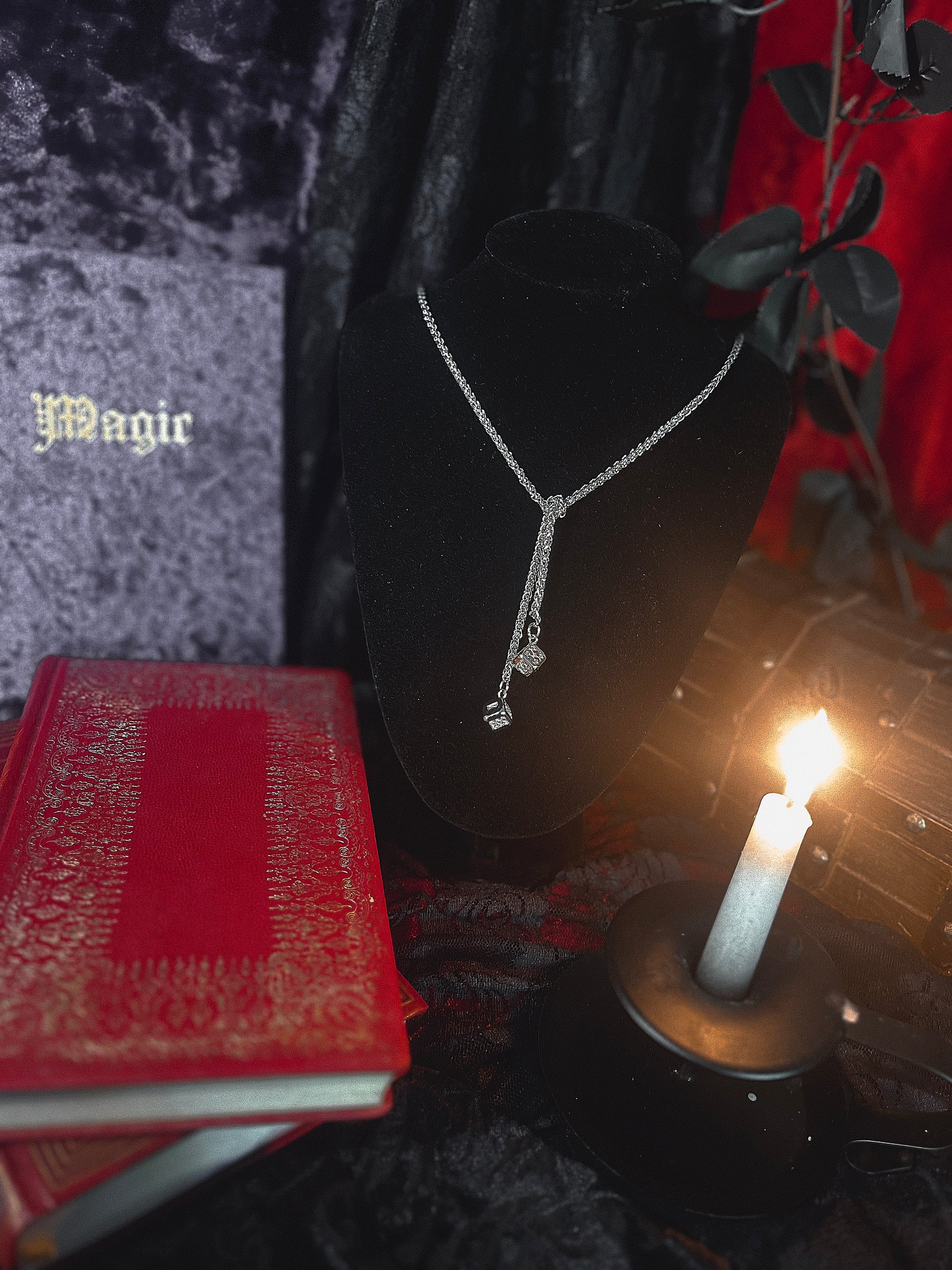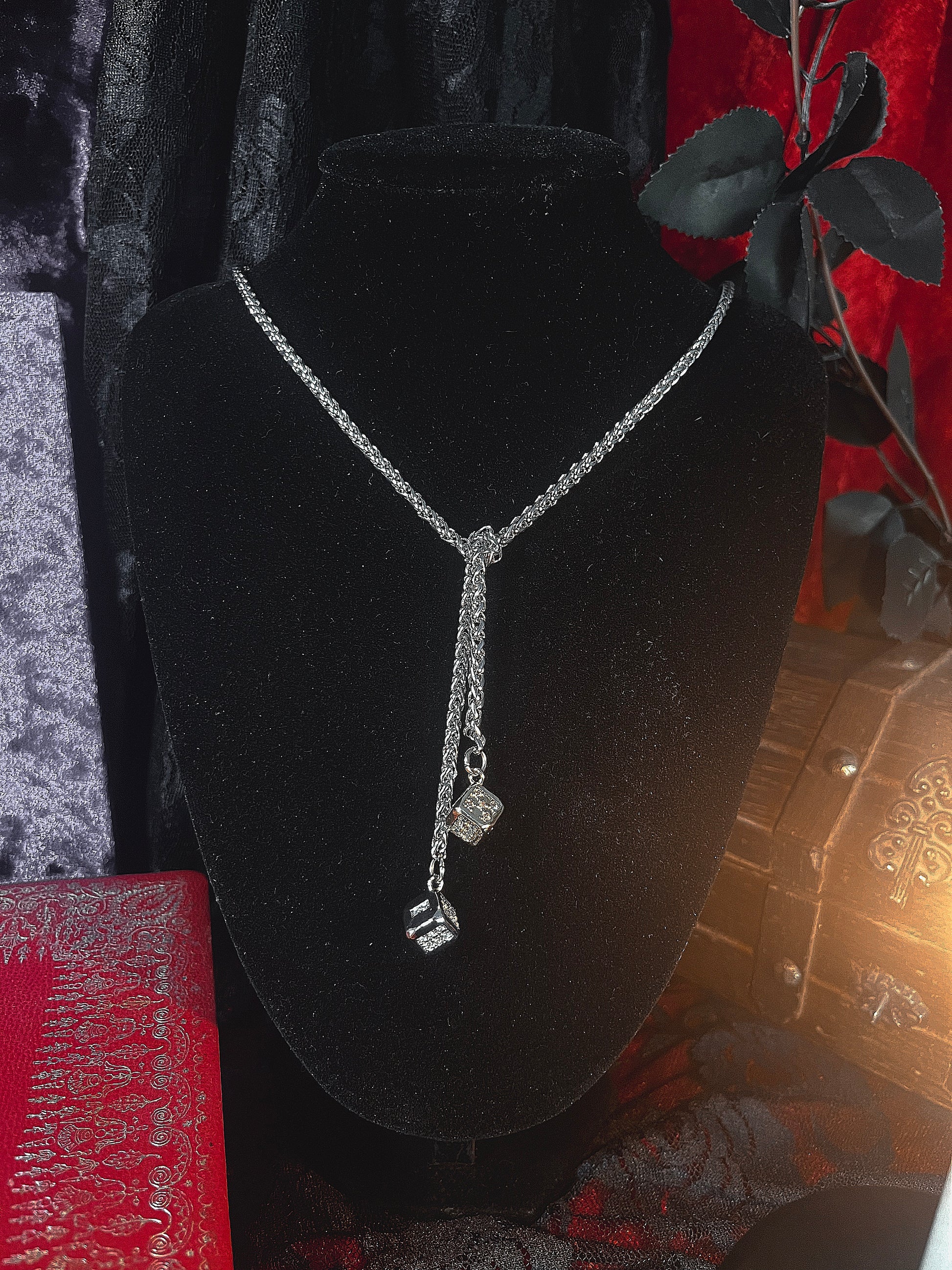 Unleash your bold side with this striking 17-inch stainless steel chain, a sleek foundation for a daring design. Suspended from it are mixed metal dice pendants, with a captivating combination of gold and silver that adds a touch of luxe and intrigue. Perfect for those who embrace chance and style in equal measure. 🖤