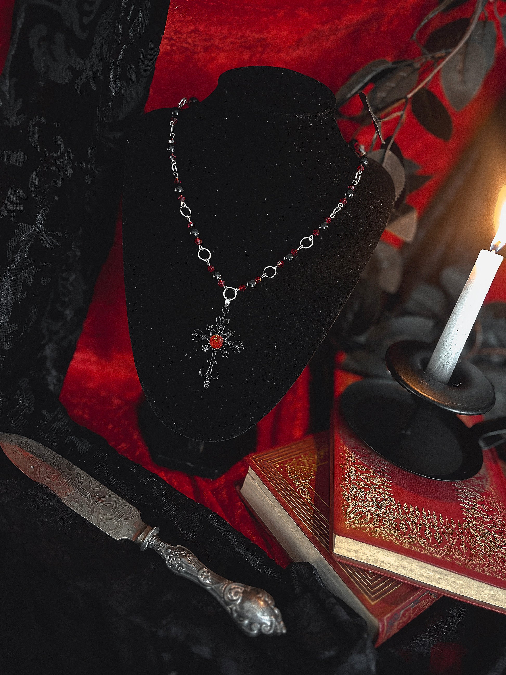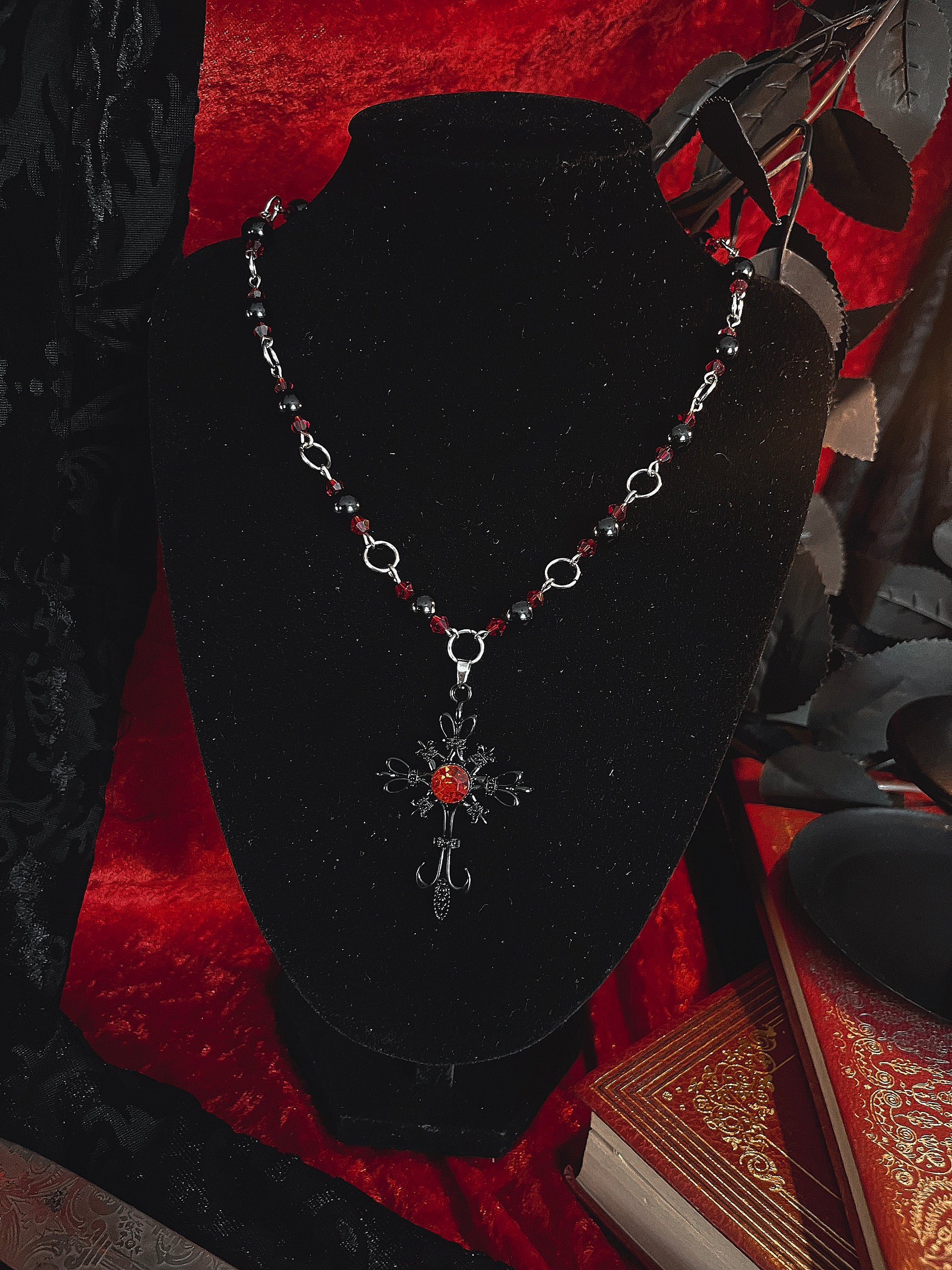 Unleash your dark side with this striking red gothic cross necklace, featuring a captivating combination of stone and resin beads that evoke a sense of mystery and passion. The stainless steel fixings ensure durability, while the mixed metal pendant in the shape of a gothic cross adds a bold focal point. With an 18-inch chain and a 2-inch extender, this adjustable piece beautifully captures the essence of gothic elegance and rebellious spirit.