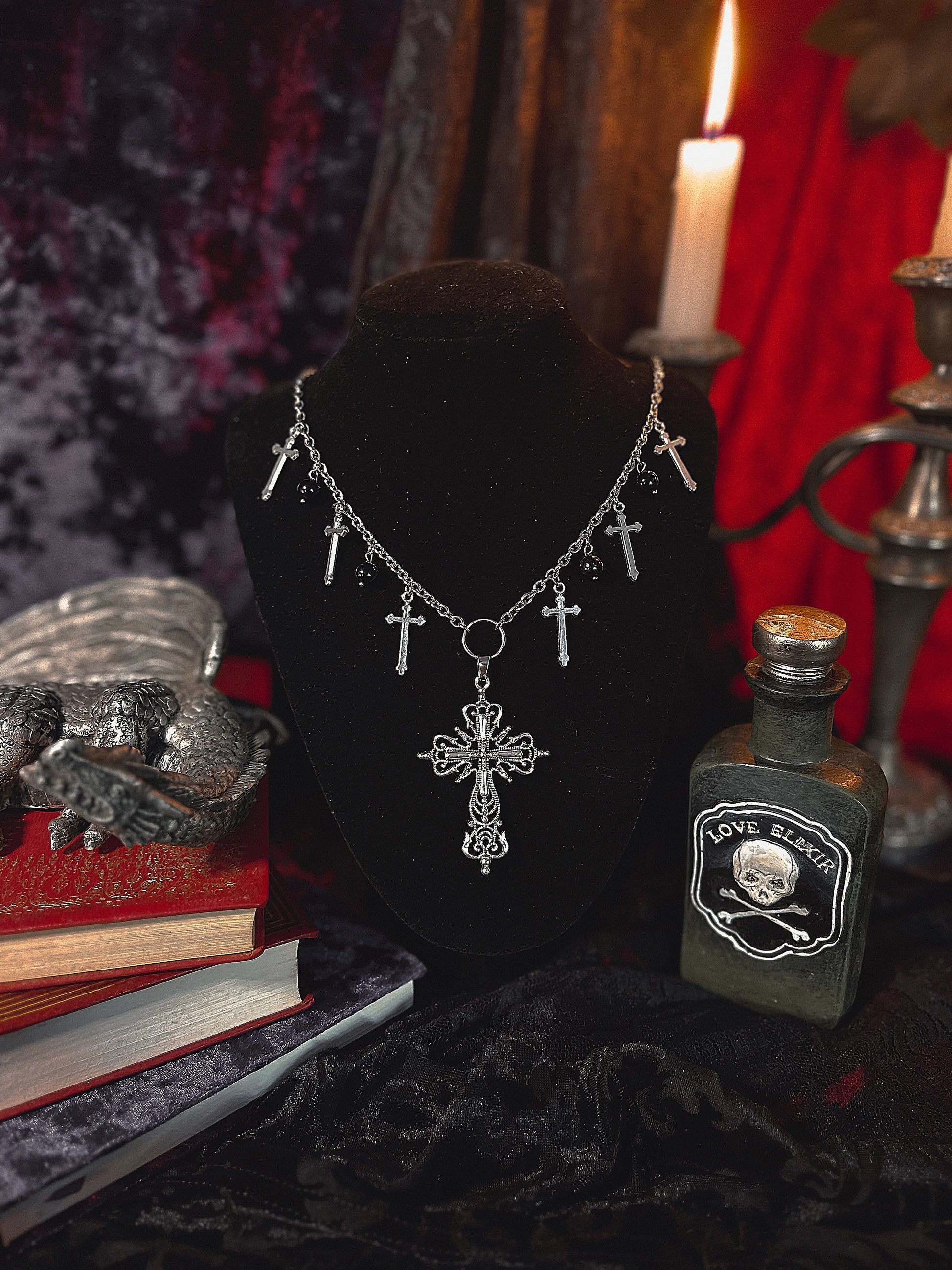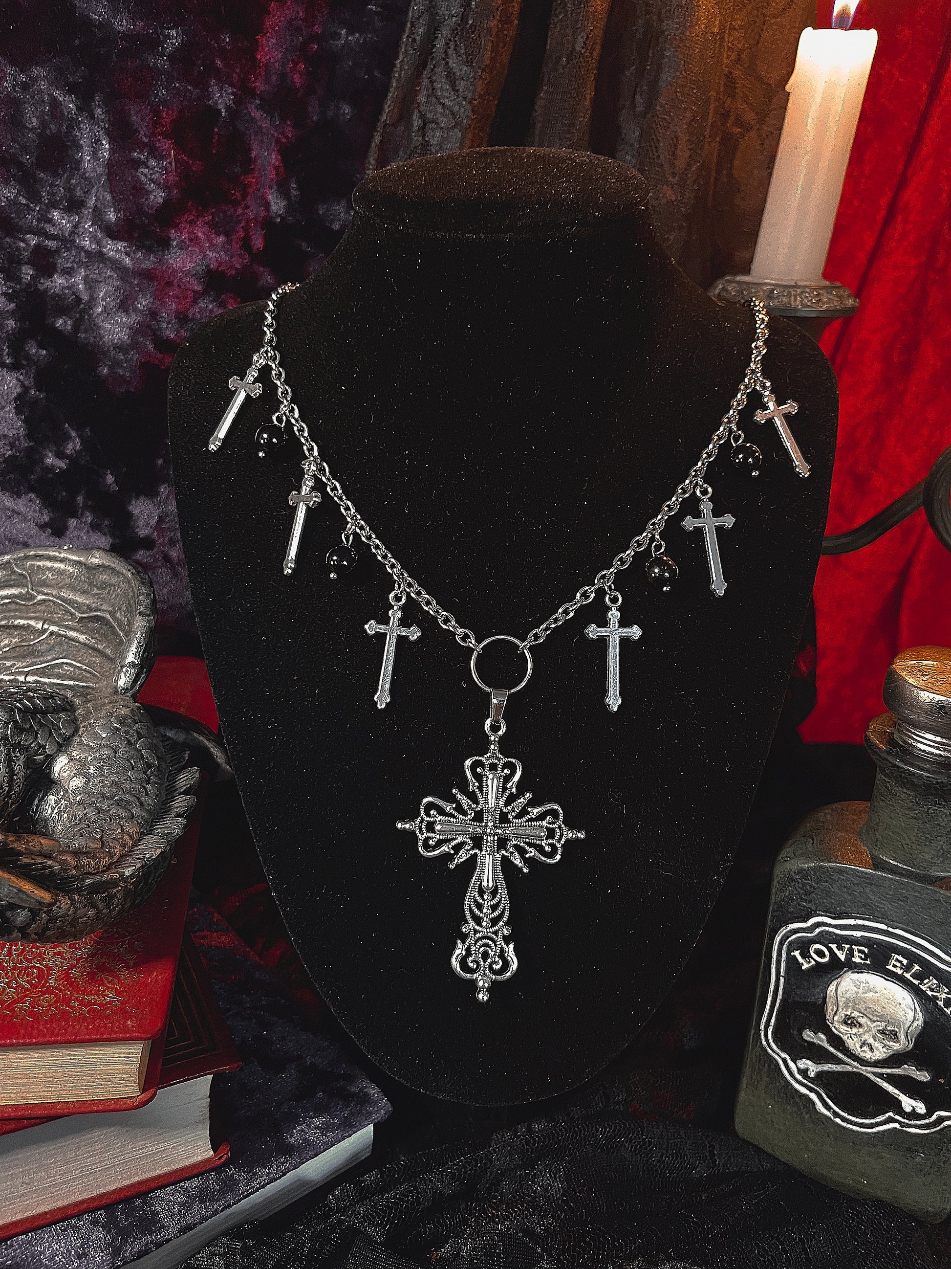 Make a bold statement with this 18-inch stainless steel chain, featuring a 2-inch extender for the perfect fit. The necklace is adorned with mixed metal and bead pendants, adding an eclectic touch of gothic elegance and modern flair. A piece that seamlessly blends strength and style, perfect for those who love to stand out with unique, striking accessories. 🖤